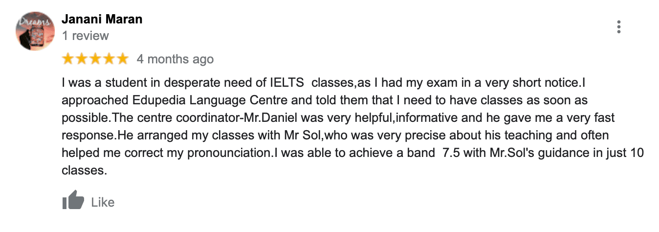 I was a student in desperate need of IELTS classes, as I had my exam in a very short notice. The centre coordinator arranged my classes with Edupedia, who was very precise about his teaching and often helped me correct my pronunciation. I was able to achieve a band 7.5 in just 10 classes.